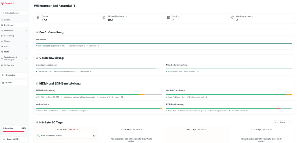 Bei Factorial IT steuert der Employee Lifecycle den Device Lifecycle. Wenn HR einen neuen Mitarbeitenden anlegt, kann die Plattform das Notebook beschaffen, per Zero-Touch konfigurieren, Konten in Slack, Google Workspace oder Notion bereitstellen und die entsprechenden Sicherheitsrichtlinien anwenden. Verlässt jemand das Unternehmen, wird das Gerät gesperrt und alle Zugänge werden innerhalb weniger Minuten entzogen.