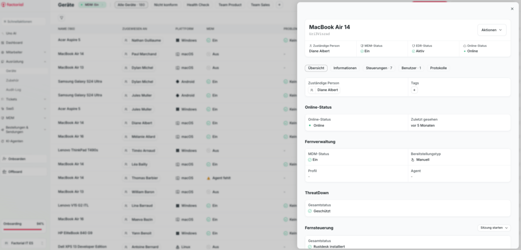 In diesem Szenario kann Jamf als Apple-Lösung sehr gut passen, zwingt dich aber dazu, den Stack für Windows mit einem weiteren Tool zu ergänzen. Factorial IT ermöglicht dagegen einen stärker vereinheitlichten Blick auf die gesamte Geräteflotte.