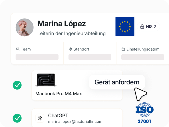 Würde Ihre IT heute ein NIS2-Audit bestehen? Factorial IT bündelt Inventar, Zugriffe und die Nachverfolgung des Mitarbeiterlebenszyklus. Für jedes Audit bereit. Demo anfordern