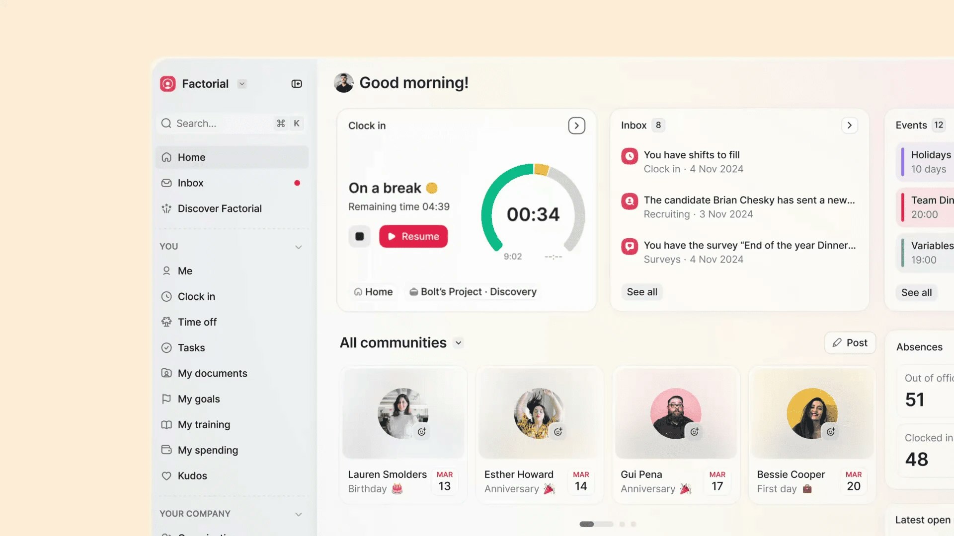 Urlaubsanträge, Ausgabenfreigaben, Gehaltsabrechnungen… Factorial übernimmt die Routineaufgaben, sodass Sie mehr Zeit haben, Ihr Team zu fördern und das volle Potenzial auszuschöpfen – damit Ihr Unternehmen erfolgreich wächst.