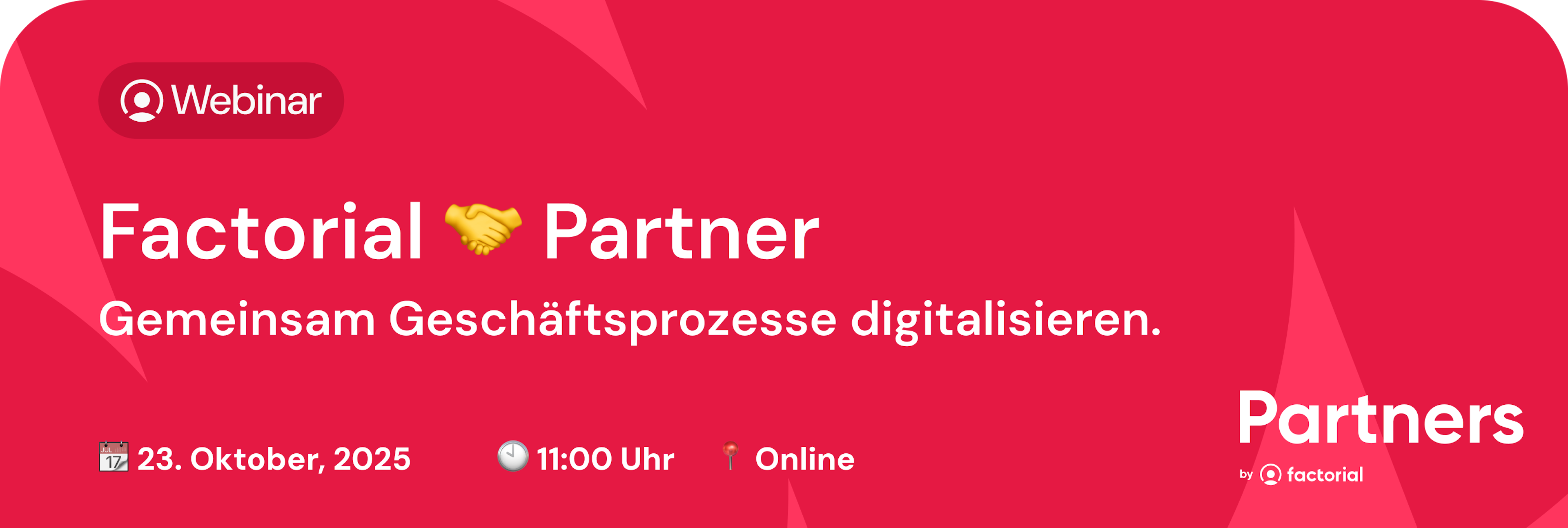Erleben Sie im Partner-Webinar, wie Sie vom wachsenden HR-Markt profitieren! Factorial ergänzt bestehende Systeme, automatisiert Prozesse und bietet smarte Lösungen für Recruiting, Zeiterfassung & digitale Personalakten – inkl. Erfolgsstories & Partner-Insights.