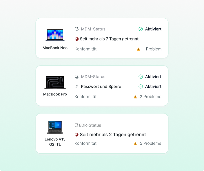 Reibungsloses Onboarding und OffboardingVerwandeln Sie HR-Änderungen in IT-Aktionen. Stellen Sie vom ersten Tag an das passende Gerät und die richtigen Zugriffe bereit und entfernen Sie Zugriffe sauber, wenn sich Rollen ändern oder jemand das Unternehmen verlässt.