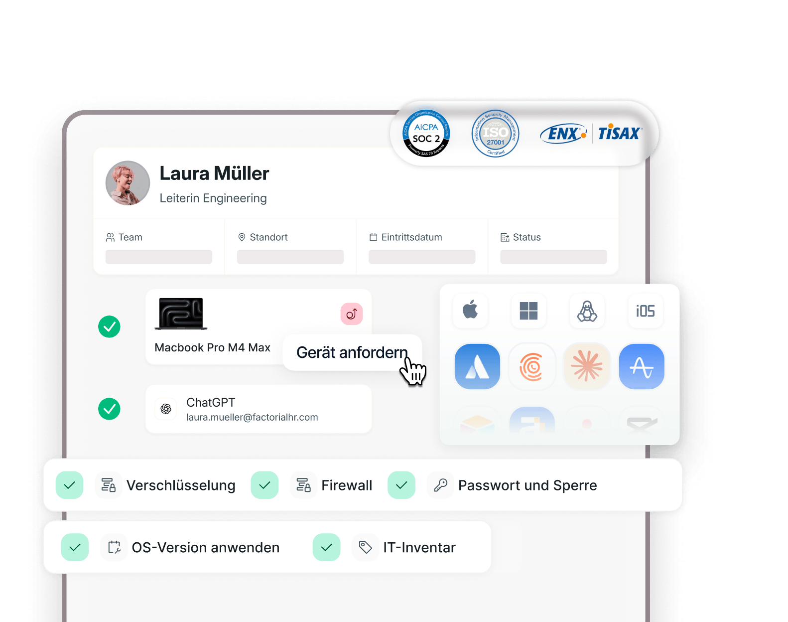 Keine getrennten Tools pro Betriebssystem. Keine manuellen Prozesse. Vom ersten Tag an mit Ihren HR-Daten verbunden.