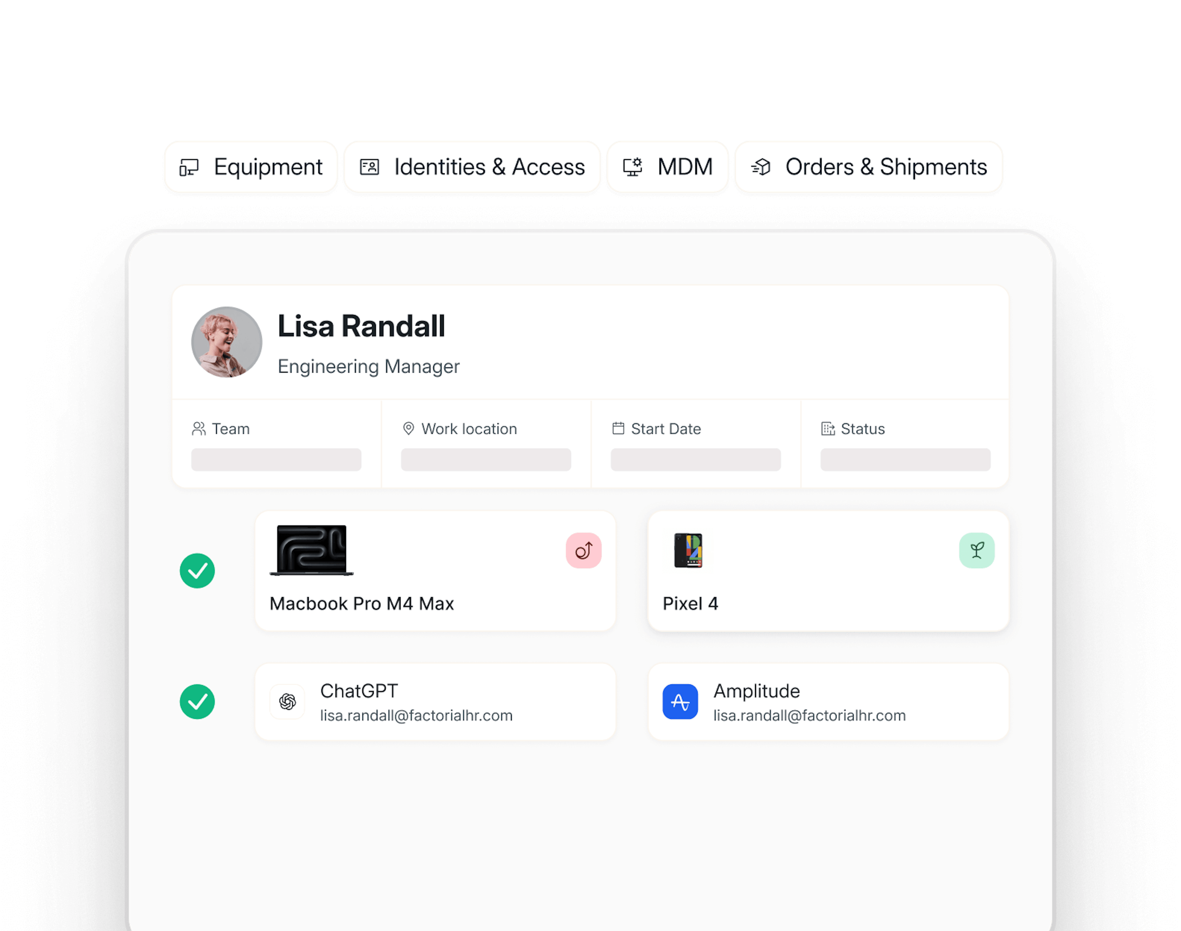 Factorial hilft Ihnen dabei, Compliance schneller zu erreichen, indem bis zu 65 % des Aufwands automatisiert werden. Ersetzen Sie fragmentierte Tools und anfällige Tabellen durch ein einheitliches IT-Betriebssystem. Automatisieren Sie die Endpoint-Sicherheit, steuern Sie SaaS-Zugriffe und erstellen Sie Audit-Nachweise nahtlos.