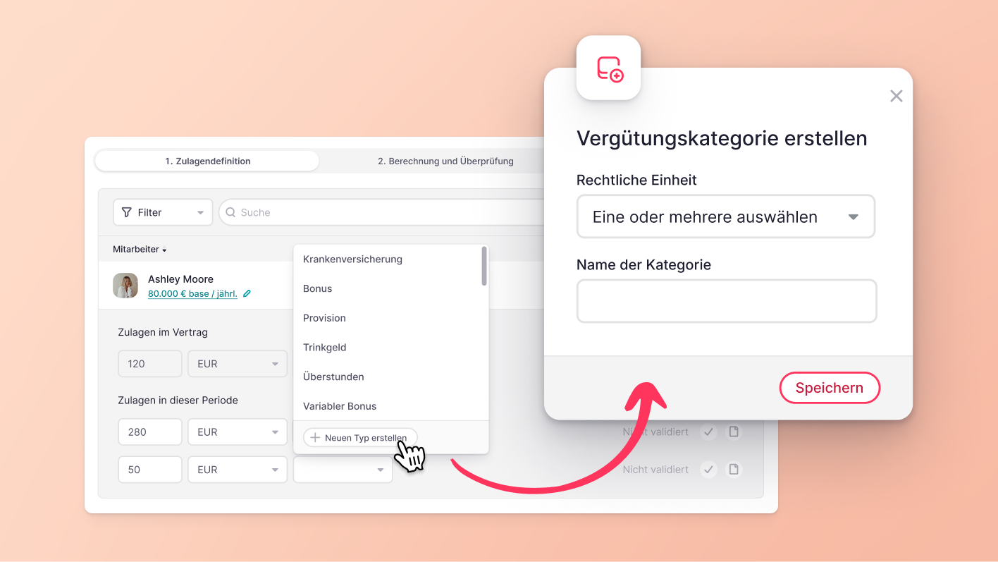 Bisher musste man, um eine neue Kompensationsart hinzuzufügen, durch Einstellungen > Unternehmensdetails > Rechtliche Einheiten > Verträge > Zusätzliche Vergütung navigieren. Ab sofort können Sie mit den entsprechenden Berechtigungen neue Kompensationskategorien direkt im Zulagen-Bereich des Gehaltsabrechnungs-Workflows erstellen und zwar genau dann, wenn Sie sie benötigen.