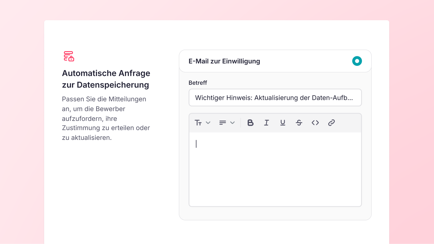 - Ein-Klick-Genehmigung für Bewerbende – Bewerbende erhalten eine E-Mail mit Ihrem Branding und einem einfachen Button, um ihre Einwilligung aktiv zu verlängern.