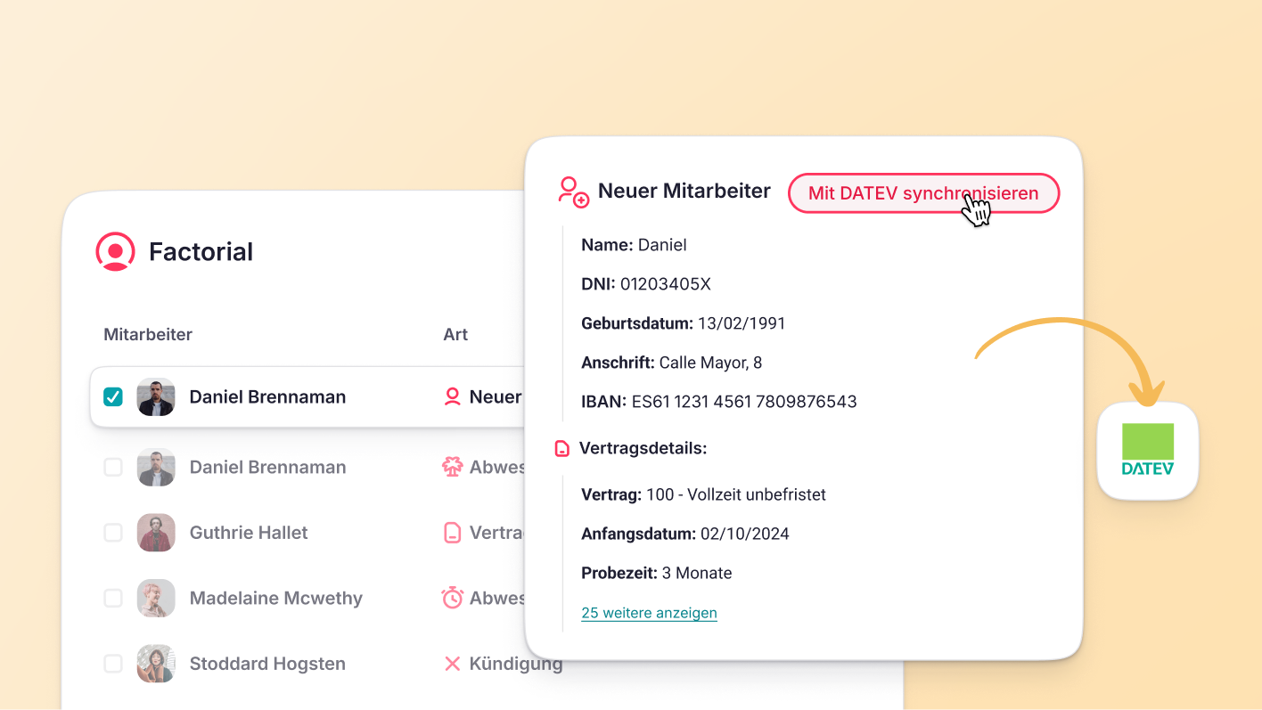 Die DATEV-Integration spart Ihnen Zeit, indem sie alle Datenarten mühelos synchronisiert, einschließlich neuer Mitarbeitender, Aktualisierungen, Abwesenheiten, Zulagen und mehr. Dieser effiziente Prozess minimiert Fehler und verhindert Datenverluste, wodurch eine präzise Gehaltsabrechnung sichergestellt wird. Die Integration ist sowohl für DATEV Lodas als auch für DATEV Lohn und Gehalt verfügbar.