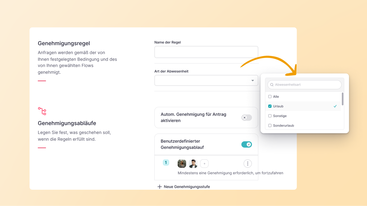 Erstellen Sie benutzerdefinierte Genehmigungsregeln für die Verwaltung von Abwesenheitsanträgen in Ihrem Unternehmen, um den Überprüfungsprozess für bestimmte Abwesenheitstypen zu automatisieren. Dies spart Zeit, ermächtigt die Teammitglieder und gewährleistet die Einhaltung der spezifischen Anforderungen und Richtlinien Ihres Unternehmens.